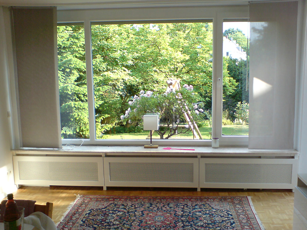 Heizkörperverkleidung unter vorhandener Fensterbank. Die Füllung der Rahmen besteht aus einem Lochblech, alles weiß lackiert.